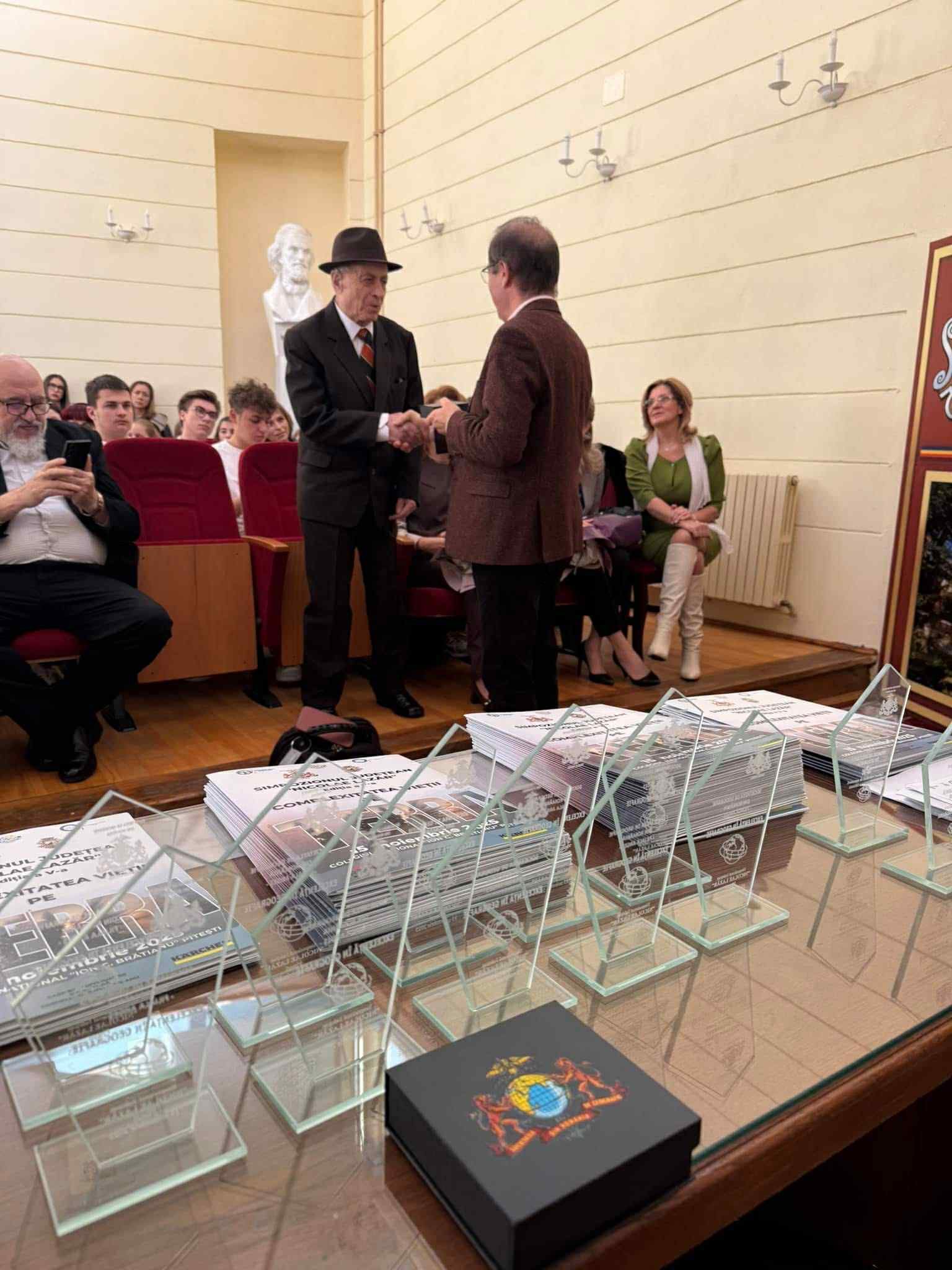 Moment deosebit: Domnului profesor Lucian Iliescu, primul președinte al SGR Argeș și conducător al filialei în perioada 1975–1998, i-a fost acordată o medalie omagială – 150 ani de la înființarea Societății de Geografie.